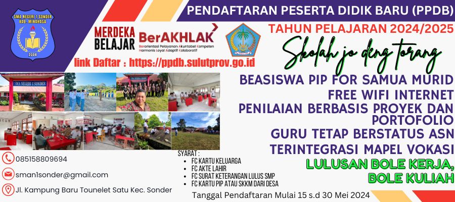 Telah dibuka Pendaftaran Peserta Didik Baru (PPDB) Tahun Pelajaran 2024/2025 SMA Negeri 1 Sonder. Syarat Pendaftaran : FC Kartu Keluarga FC akte Lahir FC Surat